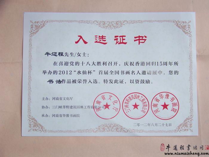 牛迈程书法作品在喜迎十八大大型书画展中被评为金奖,并在钓鱼台国宾馆展出