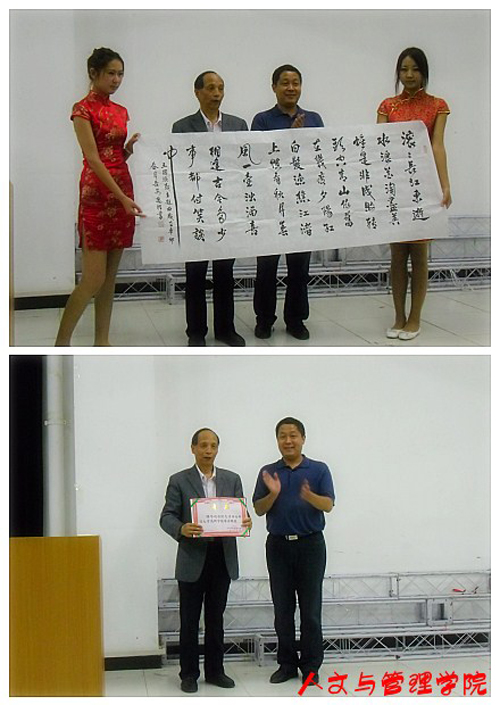 讲座后,我校将牛迈程先生聘为客座教授,并由院长丁正生为他颁发了聘书。同时牛迈程先生也将一副惜洒的墨宝送给了西安科技大学高新学院,其中蕴含了对我校师生的美好祝福。