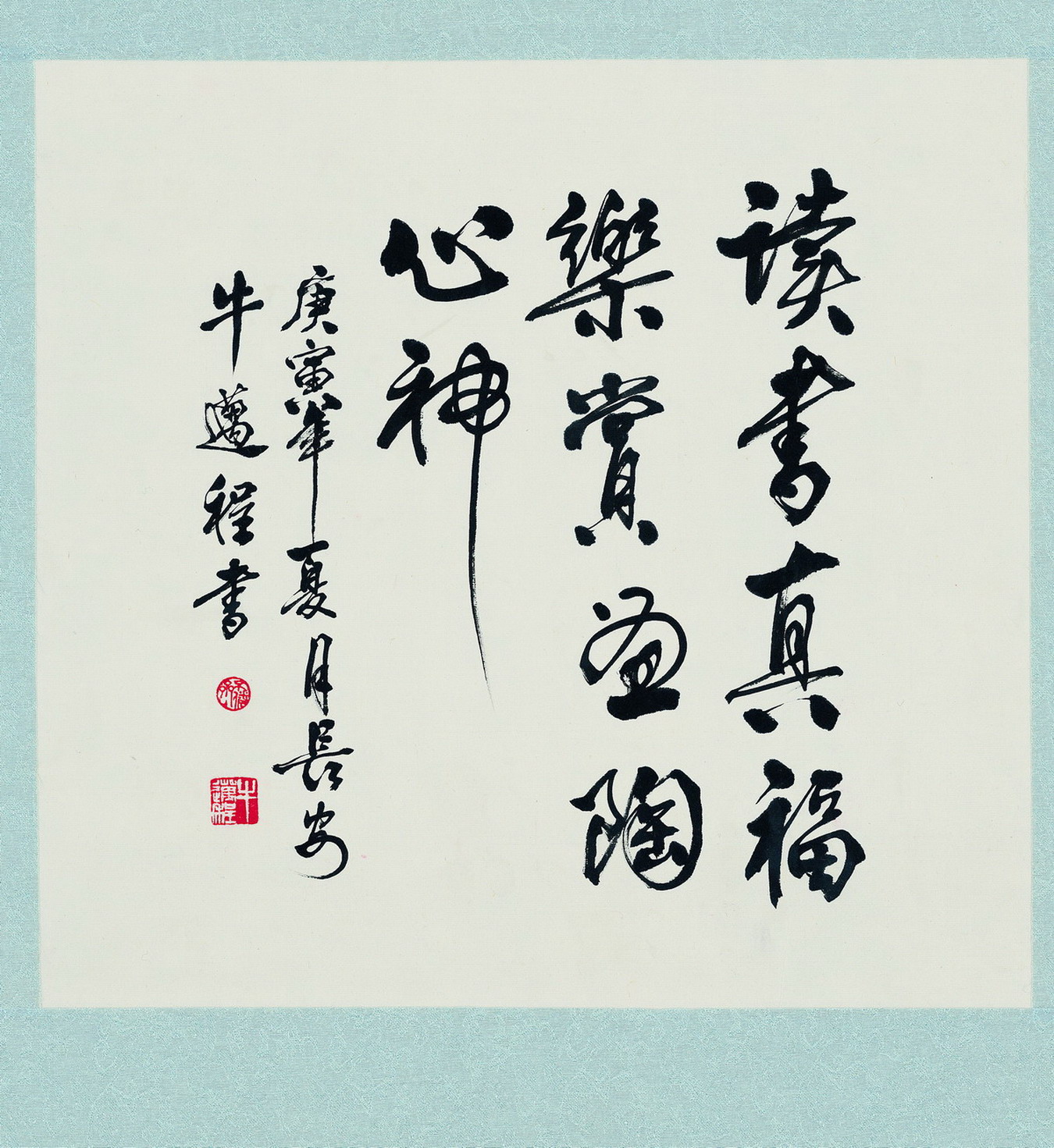 书法是高雅的艺术,也是亲民的艺术。那是上世纪80年代初,一天下午牛老师应邀在学校大教室作书法讲座。讲座结束后已到吃晚饭的时间,但同学们仍然热情高涨,排着队让牛老师题字。牛老师给每个人写了一句话,而且内容都不一样。写着写着,突然停电了,没拿到签名的同学便把他邀请到宿舍,点着蜡烛在宿舍写,直到深夜。1990年毕业班同学在校园排队让他给毕业纪念册上写赠言。这次讲座和写毕业赠言,给他留下了刻骨铭心的记忆。