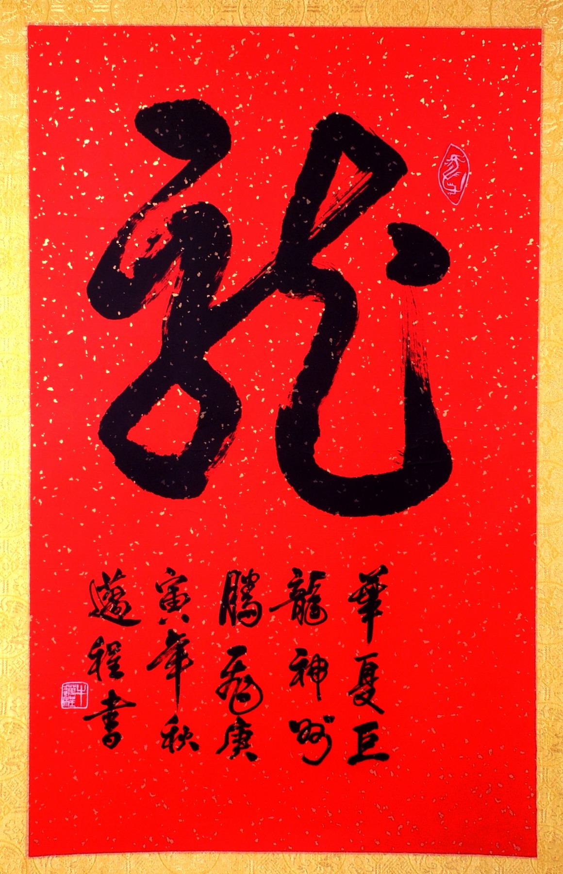 牛老师创作这幅迎世博作品,源于电视播出的在上海举办世博会的新闻,触发了他创作的灵感。他想到,中国书法是中国文化的血脉,是几千年无数书家用心血、汗水和感情铸成的无价之宝。他冥思苦想,觉得“龙腾虎跃”这四个字最能展现华夏精神。他进入一种气功状态,用气,凝神,发力,全神贯注,一气呵成。这不仅是他艺术人生心路历程的真实坦露,更是对祖国母亲举办上海世博会的自豪赞歌。