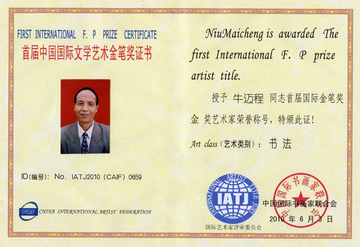 牛迈程获滕王阁杯中国南昌第九届文学艺术大奖赛大奖